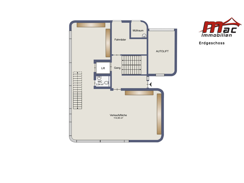 Das Geschäftsobjekt bietet zwei großzügige, lichtdurchflutete Flächen auf Erd- und Obergeschoss, die über ein eigenes Treppenhaus und einen separat steuerbaren Lift erschlossen sind.