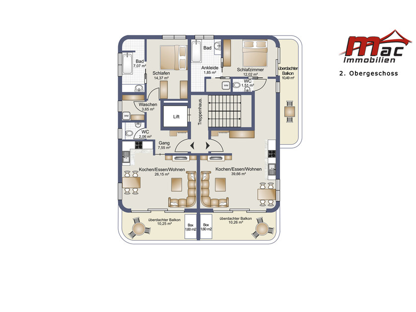 2. OG: 2 Zi-Wohnung mit 60,58 m² zzgl. Balkon mit 11,85 m² |