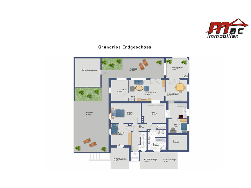 110 m², südl. Ausrichtung, teilweise begrünt, mit Gartenhäuschen |