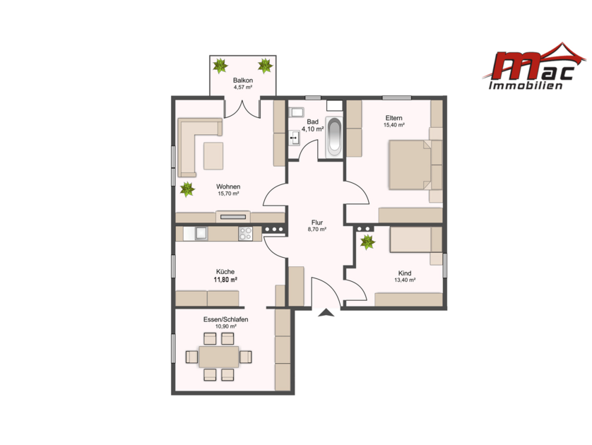 Die Raumaufteilung überzeugt mit einer geräumigen Küche, die über ein angrenzendes Esszimmer verfügt und somit ausreichend Platz für gemeinsames Kochen und Essen bietet.