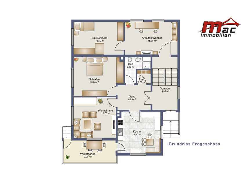 ca. 9 m², südöstlich ausgerichtet, mit Zugang zum Garten |