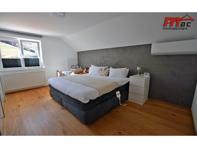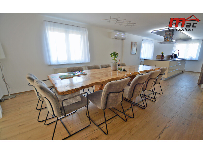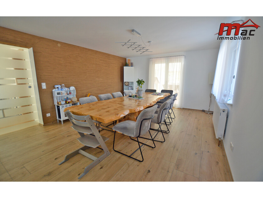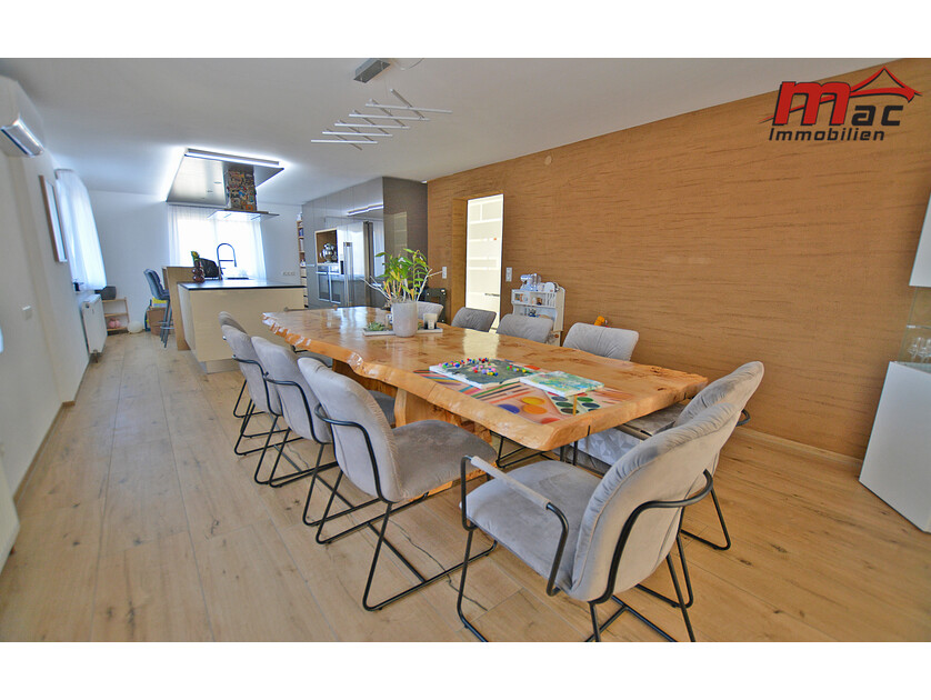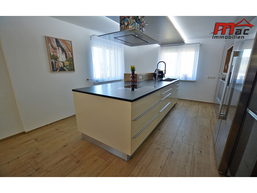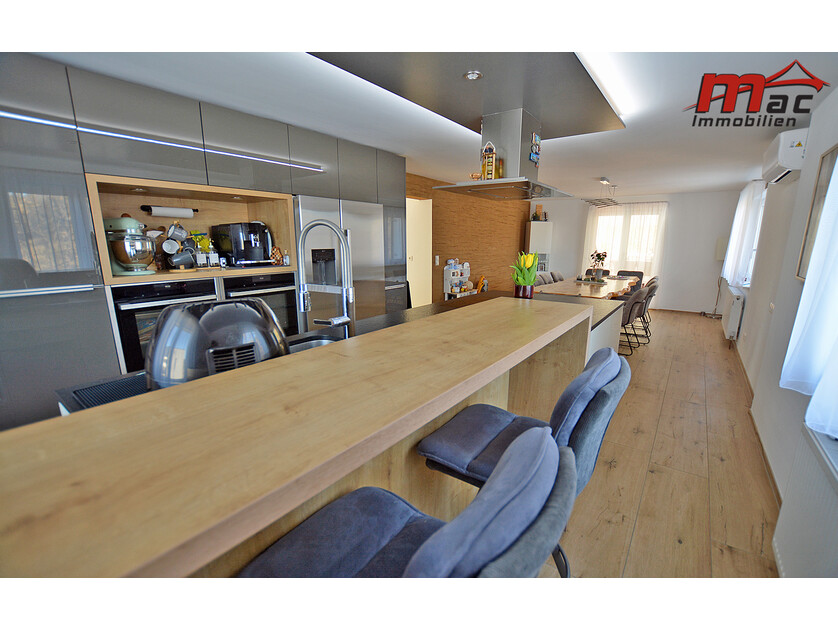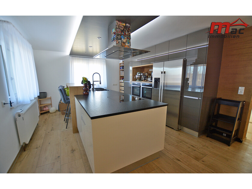 Die moderne Wäger-Küche überzeugt durch hochwertige Materialien und Geräte, darunter ein Induktionsherd, eine edle Granit-Arbeitsplatte sowie eine Kochinsel mit Barhockern. Im Obergeschoss sind bereits Anschlüsse für eine weitere Küche vorgesehen, was die flexible Nutzung als Zweiparteienhaus zusätzlich unterstreicht.