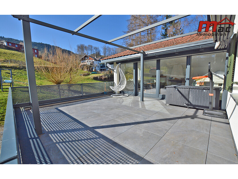 Ergänzt wird dieser durch die 25,15 m² große, teilweise überdachte und beschattete Terrasse in Südausrichtung, die mit ihrer wunderschönen Aussicht und ganztägigen Besonnung von früh bis abends begeistert.