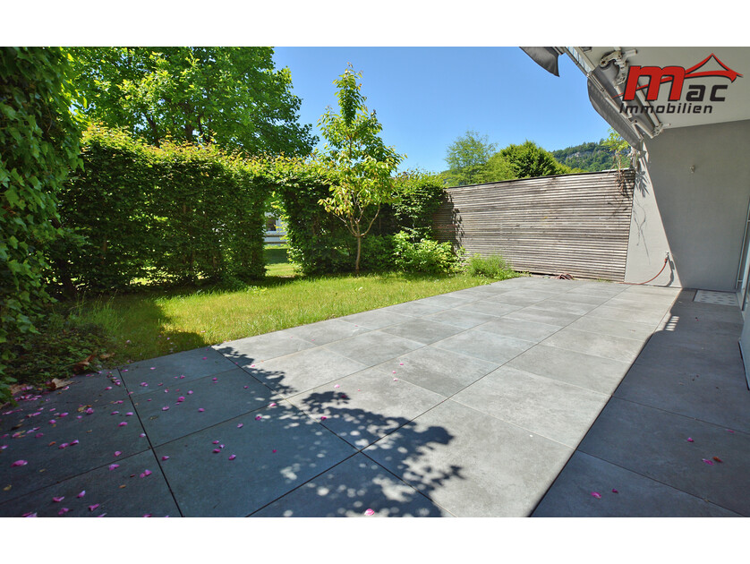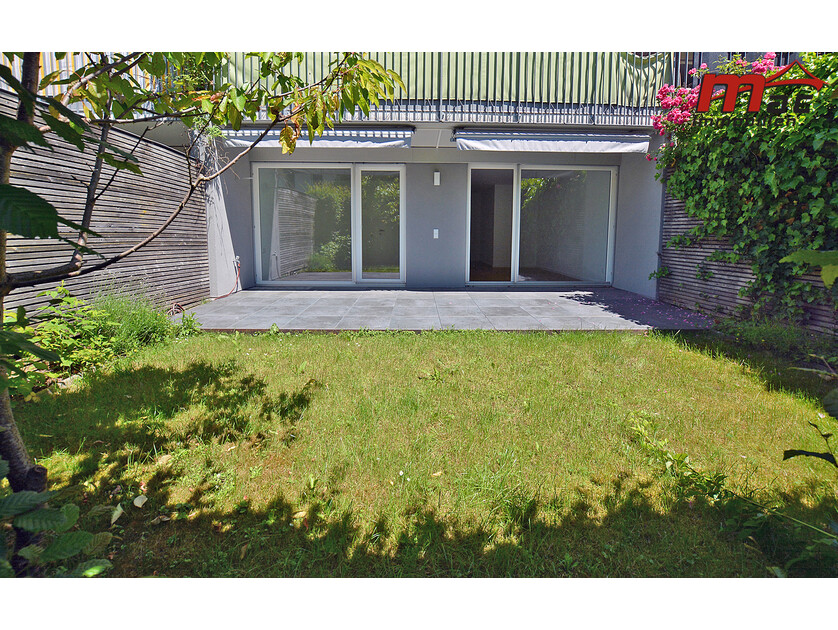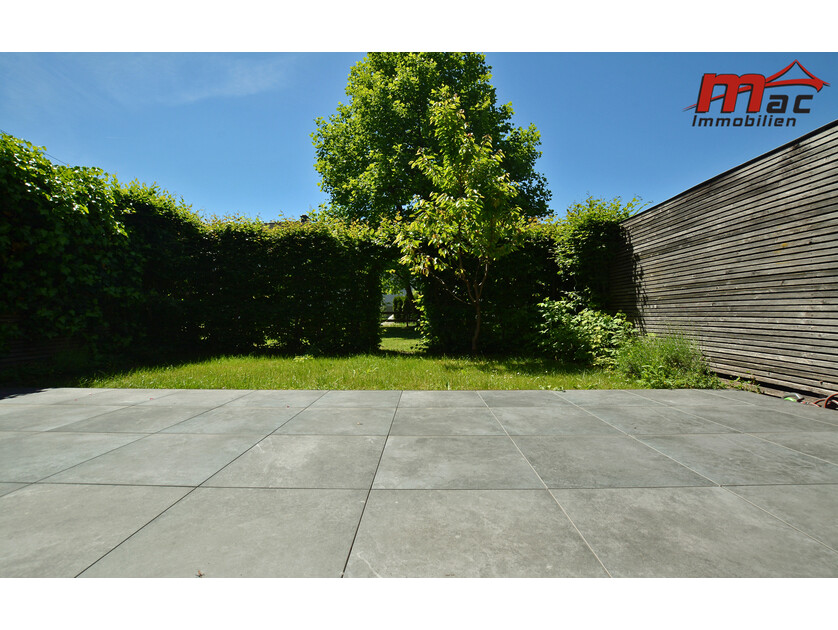 Darüber hinaus befinden sich im Freien eine überdachte Terrasse mit 14 m² wie auch der Privatgarten von 28 m².