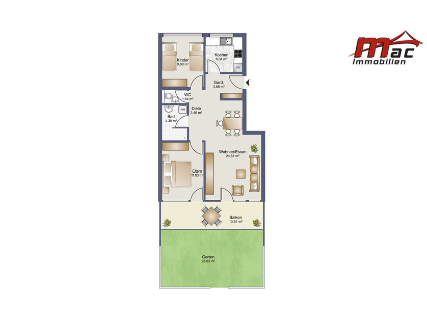 Die für alle Altersgruppen geeignete Gartenwohnung besticht durch die gut durchdachte Grundrissgestaltung mit optimaler Gestaltungsmöglichkeit.